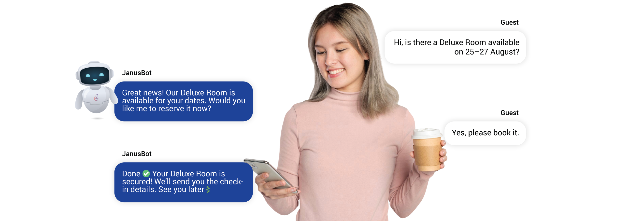Janusengages guests in real time via WhatsApp, WeChat, or your chosen communication platform — 24/7, without missing a beat.