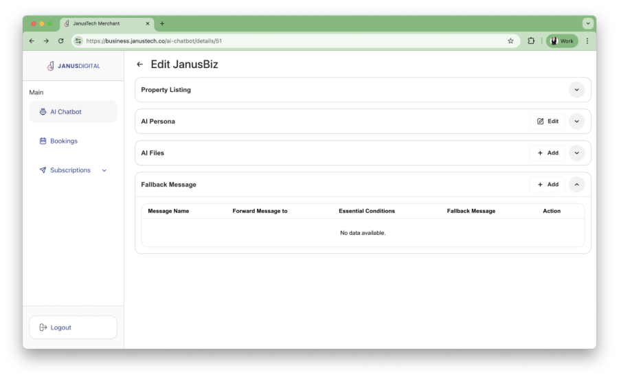 The Fallback Message section in your Janus Digital AI Chatbot ensures that no guest query is left unanswered. It acts as a safety mechanism when the chatbot cannot interpret a request or when a message falls outside the AI Persona’s trained responses.